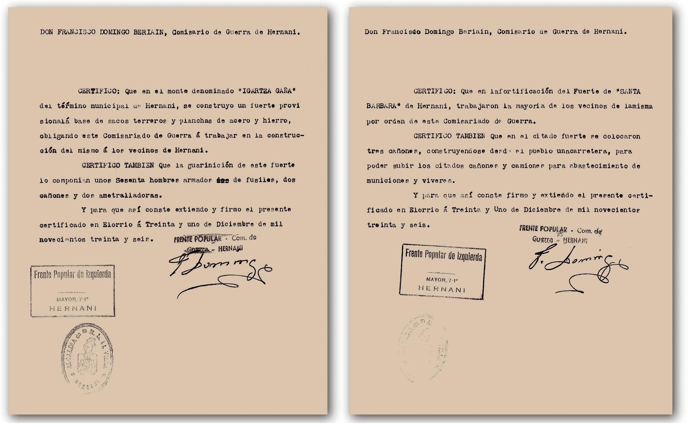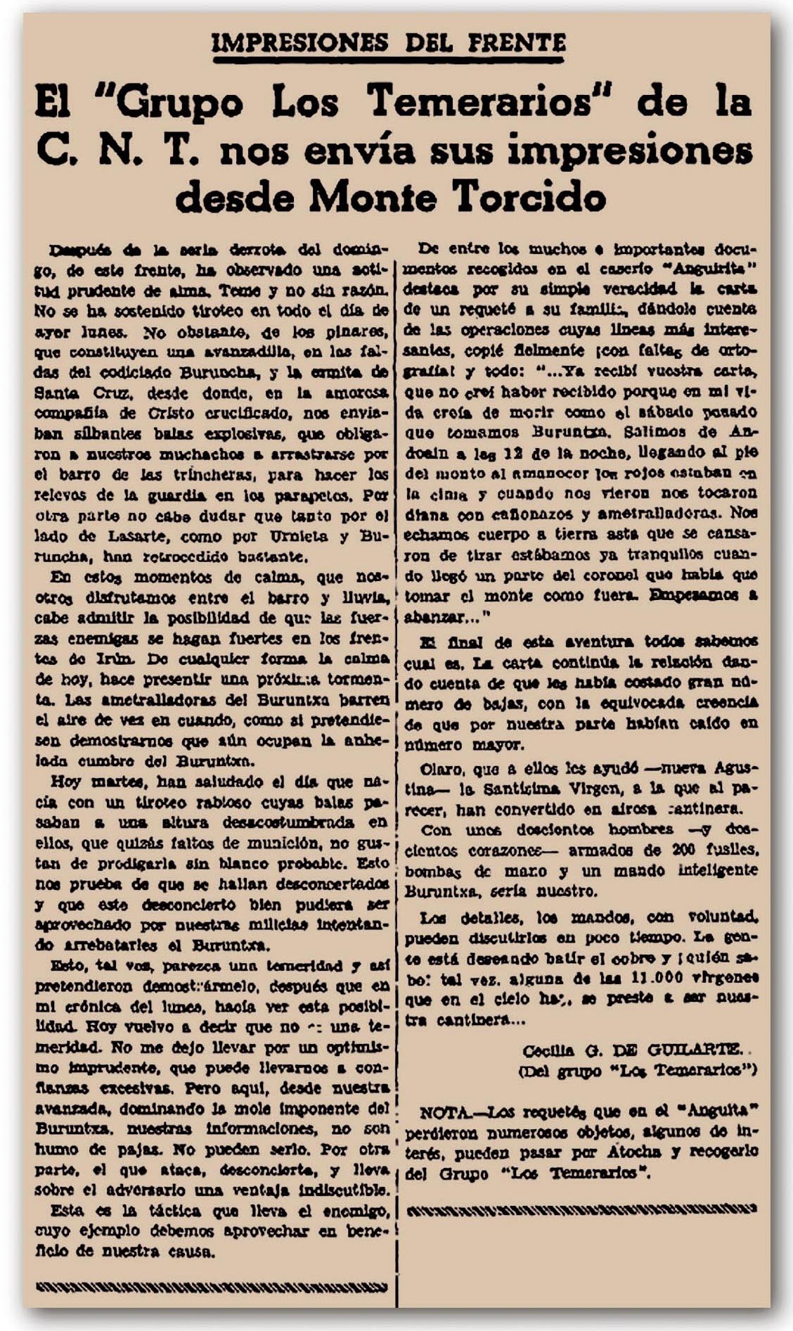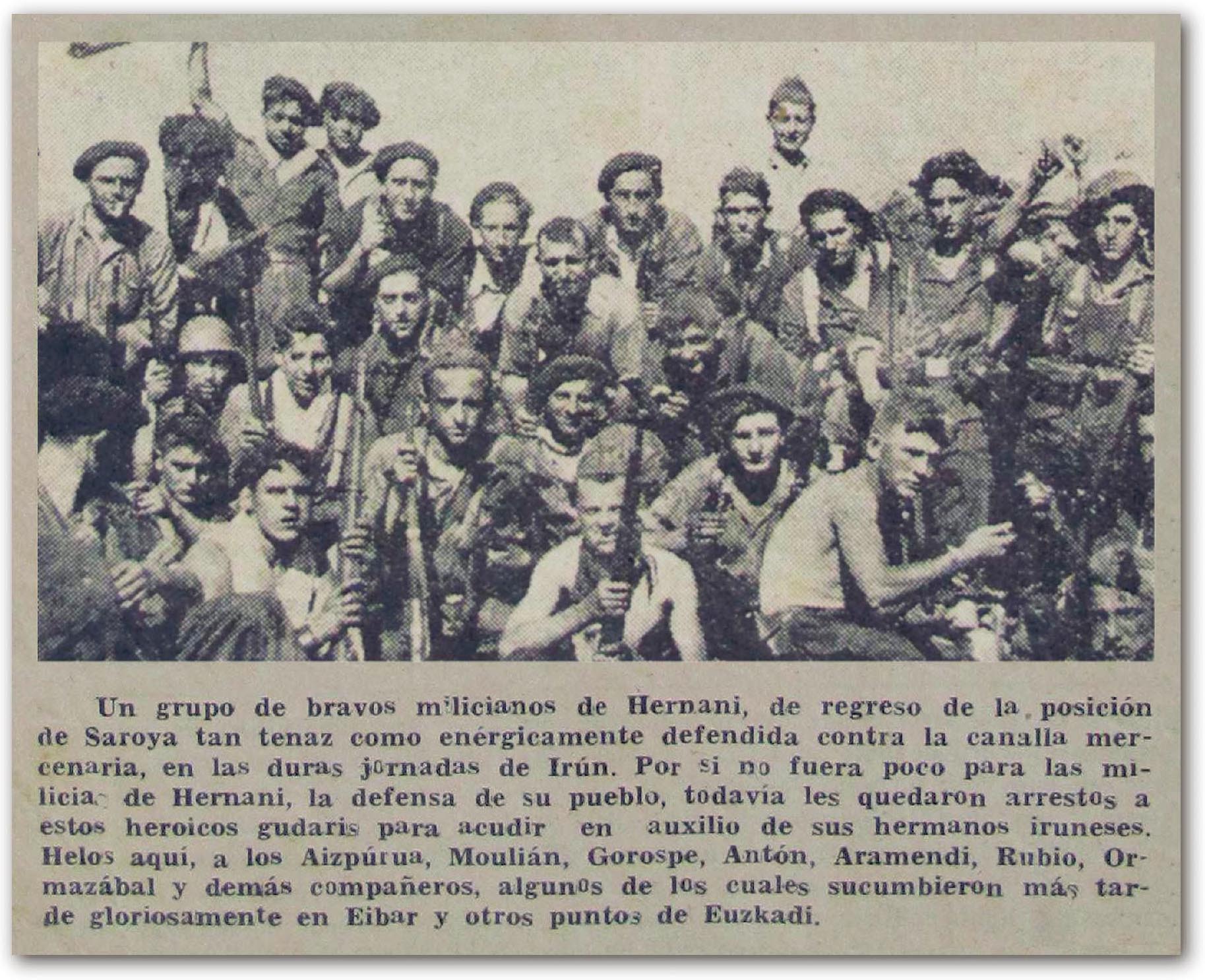 “Aste batez, Hernanik egun harrigarriak eta nahasgarriak bizi izan zituen, uztailaren 27an “Frente Popular" larrialdiko egunkariaren lehen alea iritsi zen arte. Bertan, Loiolako Kuarteletako kapitulazioaren berri jakin ahal izan zuten, Frantziako itzuliaren berri ematen zuten bitartean[119]".