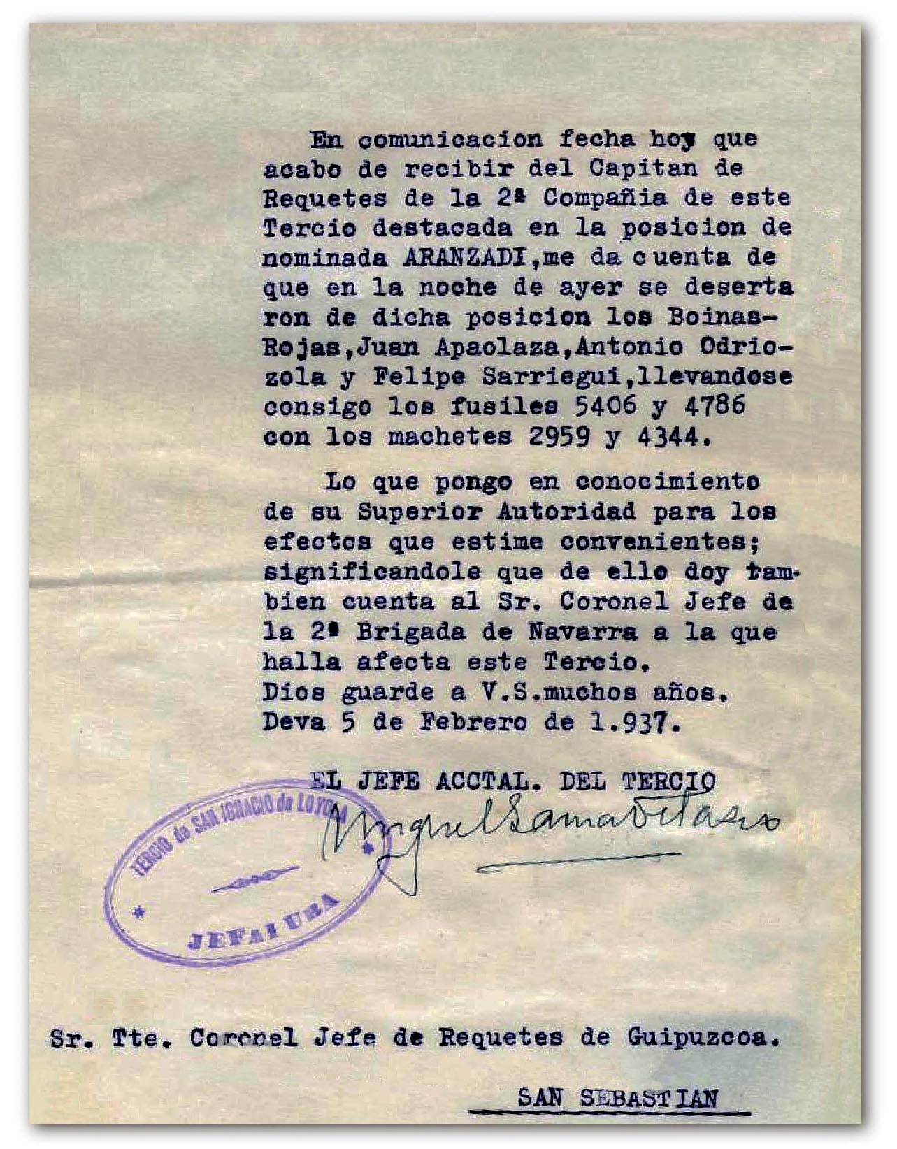 “Si de la rebelión fascista que invadió Guipuzcoa en el año 36, se hace la limpia historia, en ella jugara importante papel junto a Irún, la heroica villa de Hernani, plaza fuerte cuyo valor intrínseco no se quiso comprender. Hasta el presente a Hernani no se le hizo justicia; el pueblo aguantó impávido todos los violentos ataques que por su posesión, verdadero dechado de ambición, hizo al enemigo. Si algún día se hace justicia repito, se verá que fue eje sobre el cual giro la defensa toda de nuestro suelo, pues bastó la caída de sus fuertes y en especial de Santa Bárbara para que las milicias todas guipuzcoanas y no, nos viéramos de retroceso en retroceso, sin podernos pararnos por decirlo así en el límite de Bizkaia, es decir, verdaderamente en el lugar en que se inicia la reconquista de nuestro amado solar, mancillado por el alienígena invasor, sobre cuya depravada moral caerá y maldecirán las futuras generaciones[149]”.