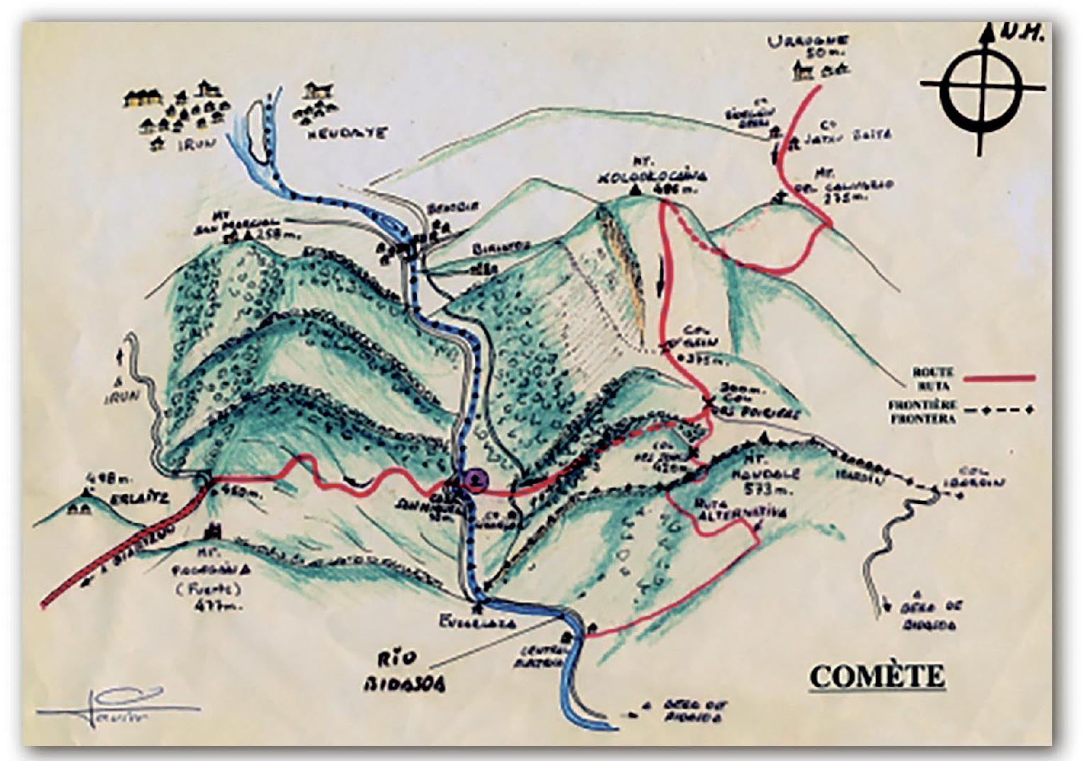 Esan bezala, Ipar Euskal Herrira iheslari hauek iritsi eta gero mugalariak egiten ziren hegazkinlarien kargu. Mugarako bideari ekiten zioten gauez, kideek bidea irekiz eta Dedéek taldea ixten zuela. Bidasoa ibaira iritsitakoan Irun eta Endarlatsa artean dagoen San Miguel geltokia zenaren inguruetan gurutzatzen zuten ibaia. Hemendik Oiartzunerako bideari ekiten zioten mendiz mendi: Sarobe baserrira joaten ziren, non atseden hartu ostean Maria Garayar hernaniarra edota honen senitartekoren bat joaten zen beraien bila. Ostean, Basteroberri etxera joaten ziren, non berriro atseden hartu, mokaduren bat jan eta goizaldean fabriketara lanera zihoazen langileekin batera bizikletaz Errenteriara joaten ziren, betiere garayartar baten laguntzarekin[1326].